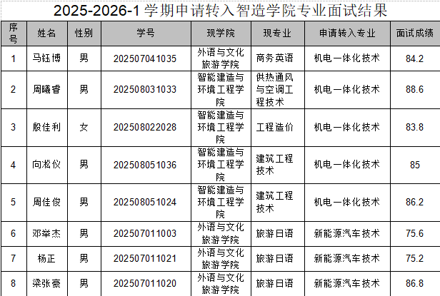 根据教务处《关于办理 2025-2026 学年第一学期学生转专业工作的通知》及《智造学院2025-2026年第一学期转专业面试考核方案》,我院于2026年1月7日组织了对申请转入我院相关专业的学生进行了面试考核,现将面试结果公示如下: