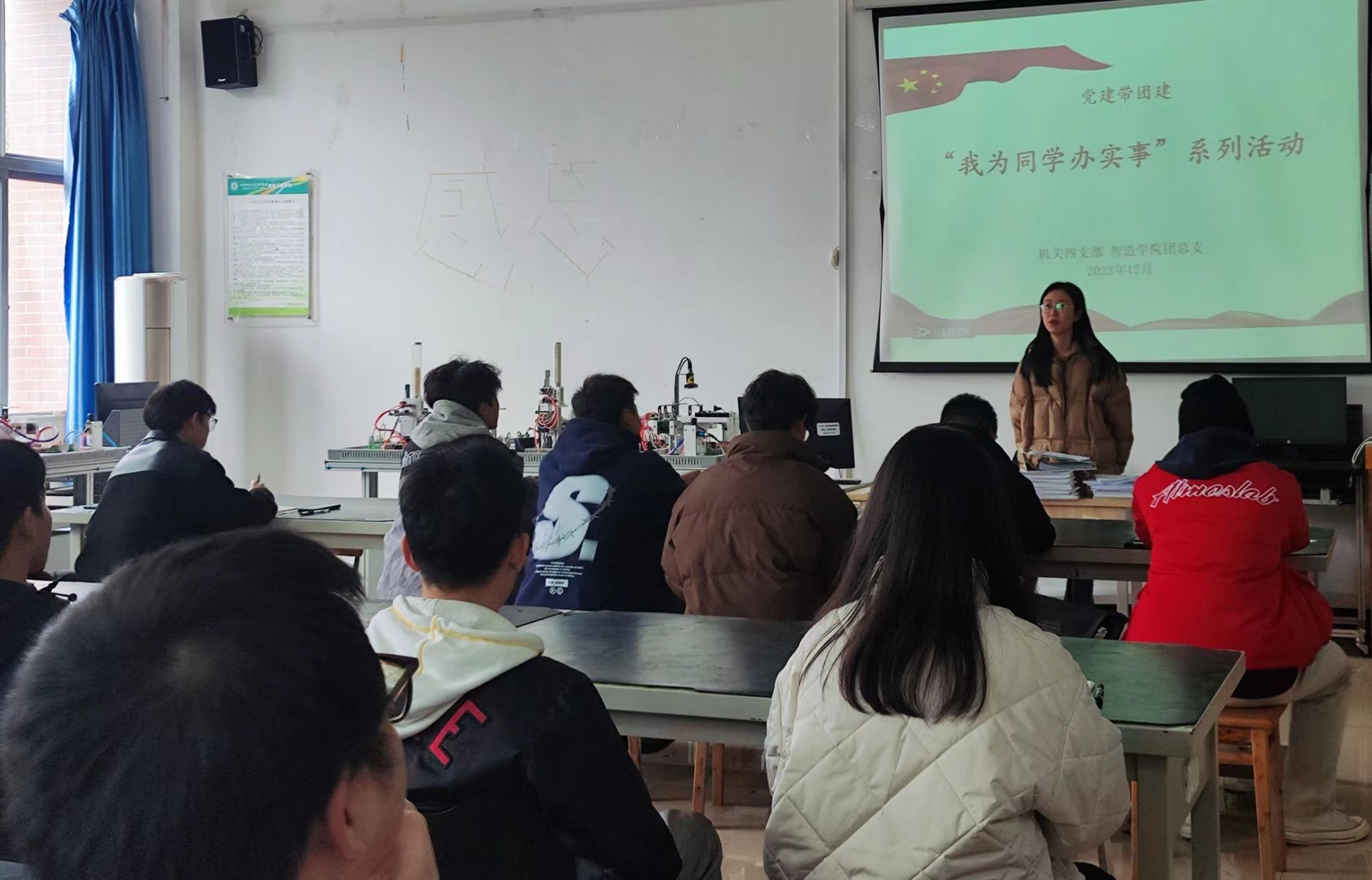 2023年12月5日智能制造与装备学院团总支在北苑实训楼B206开展党建带团建,“我为同学办实事”系列活动。本次活动邀请了学校机关党支部郭嘉琳老师为同学们讲解费用相关事宜。各班班长和团支书参加了此次会议。