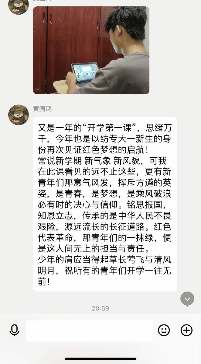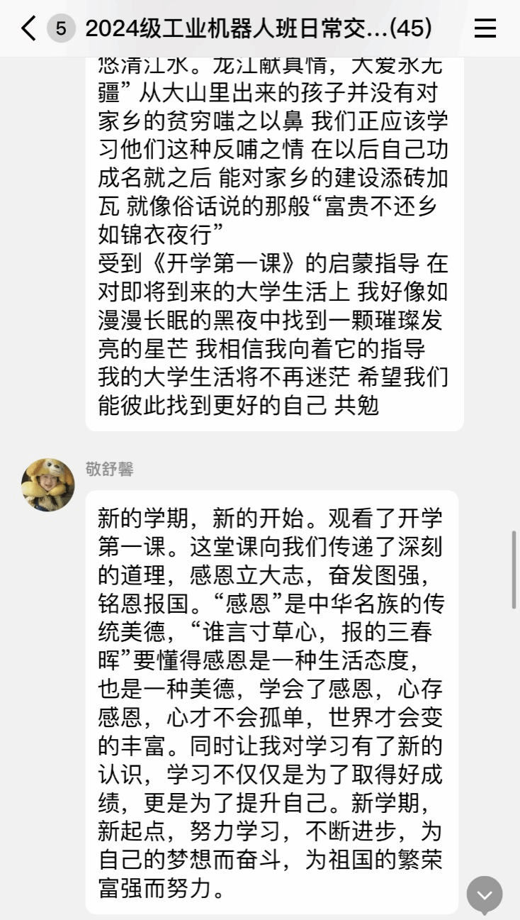 课后,智能制造与装备学院新生们在班级群内积极打卡,分享观看心得与开学感想。其中涌现出一批优秀的新生同学,例如,在谈到感恩时,黄国鸿说:“红色代表革命,那青年们的一抹绿,便是这人间无上的担当与责任。”同学们发自肺腑地感言,展现出对感恩的深刻理解和对祖国的坚定信念。