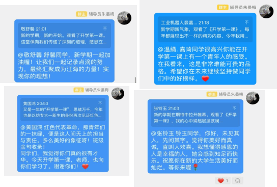 新生辅导员也向同学们分享了本次开学第一课的心得感受,并对每一位分享心得的同学给予了真诚的祝福和鼓励。