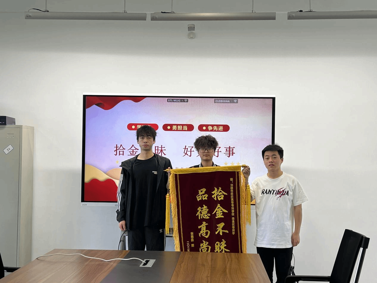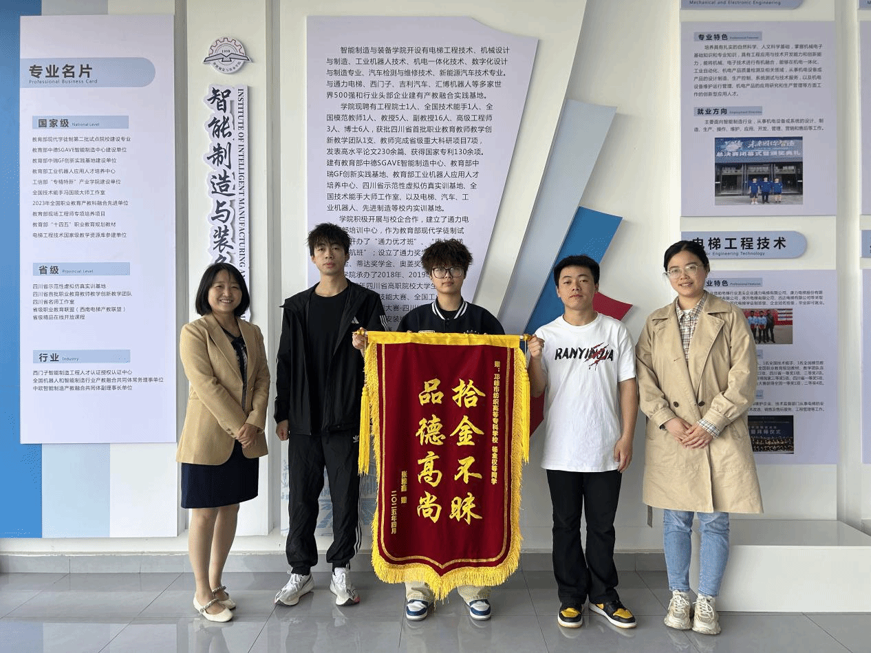学妹深受感动,专程定制锦旗送至学校,上书“拾金不昧,品德高尚”,向杨金权及余原锐同学表达诚挚谢意。是两位学长的热情引导和暖心帮助,让邛崃学妹有了对大学的美好期望。