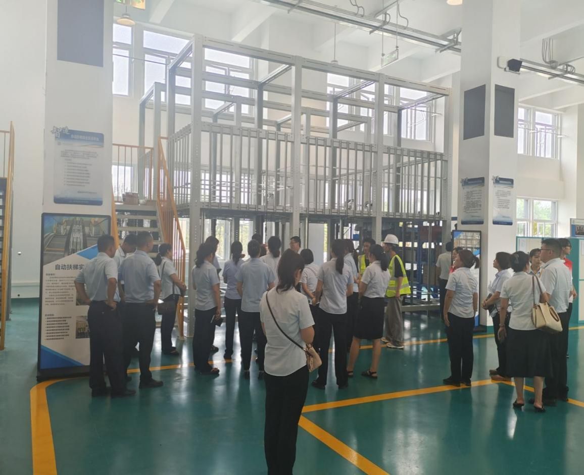 电梯实训室作为校区重点实训场所,配备了包括自动扶梯、直梯系统、限速器张紧装置等多类型教学设备,广泛应用于学生实操教学与企业员工培训。瑞云物业此次来访,旨在实地了解设备运行原理与使用要求,为日常设施管理和后续技术服务打下基础。在自动扶梯实训区,团队重点查看了透明桁架结构下的传动系统演示设备,现场了解梯级链条、梳齿板、扶手带同步驱动等关键机构的运行方式。电梯实训助理们详细介绍了扶梯的结构原理。在直梯实训区域,参观团队与中心工作人员围绕曳引系统、限速器、安全钳和轿厢结构展开了交流。