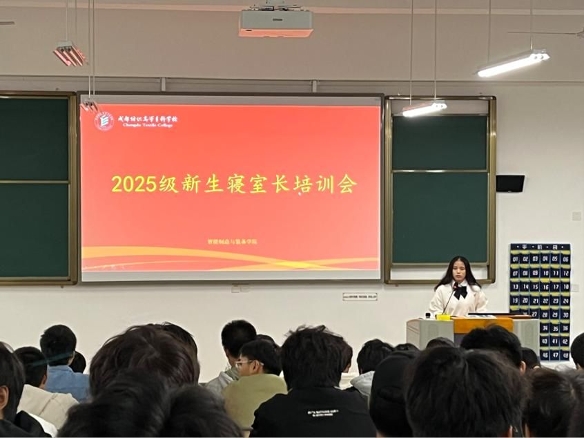 2025年10月27日晚,成都纺织高等专科学校智能制造与装备学院在知著楼C202开展了2025级新生寝室长培训会。本次培训会强化寝室长责任意识,统一了寝室管理标准和信息反馈流程,并对寝室内学生心理问题进行预防做培训。