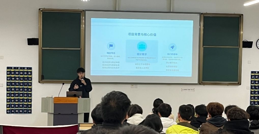 接下来,曾参与暑期实践的团干代表黄国鸿同学分享了暑假期间学院在渔箭社区开展“三下乡”活动的相关情况,包括为“托管班”儿童提供课业辅导与科普教育,以及面向社区老年人开展关爱活动,生动的案例让大家深刻体会到青年服务社会的价值。