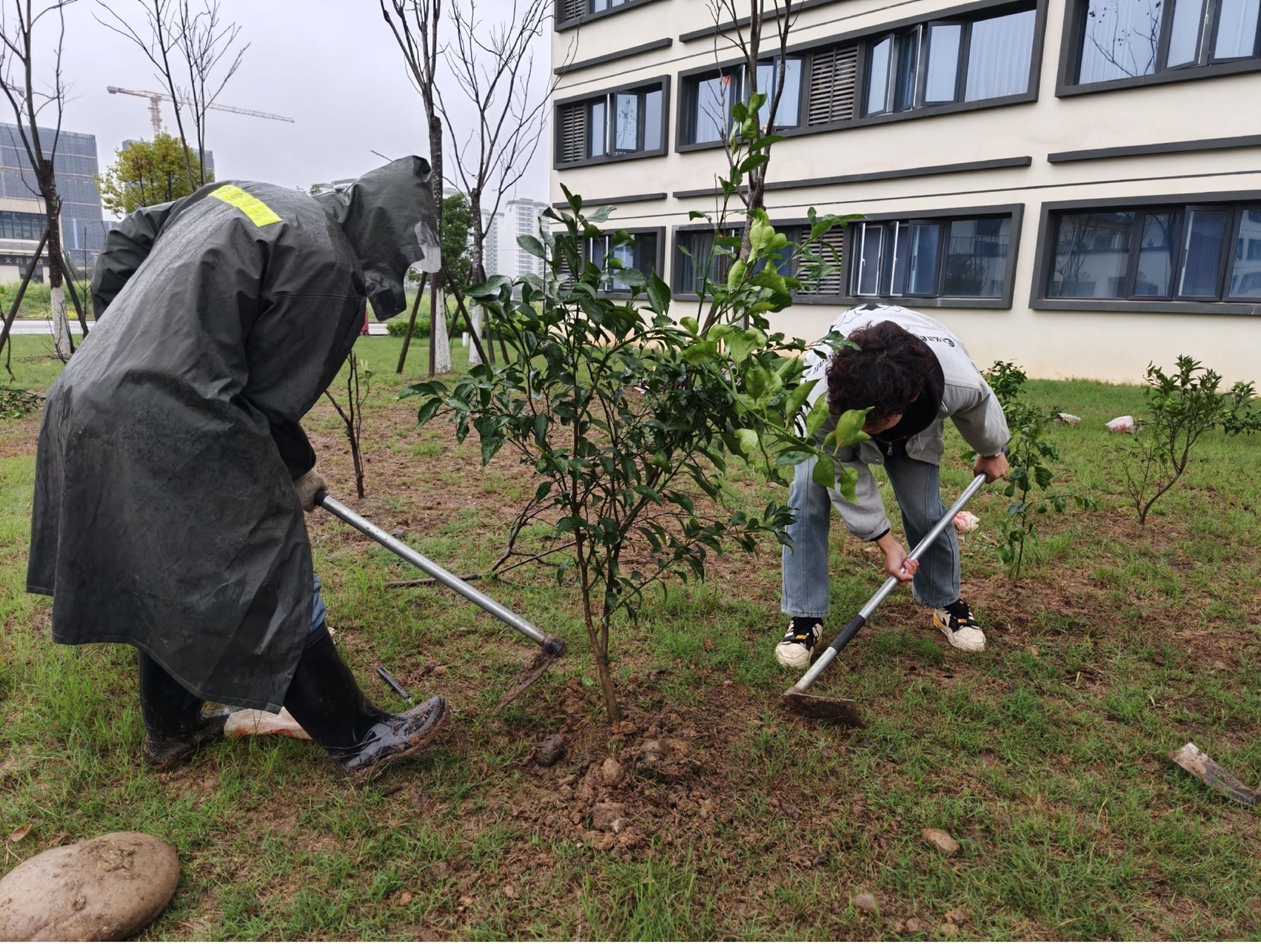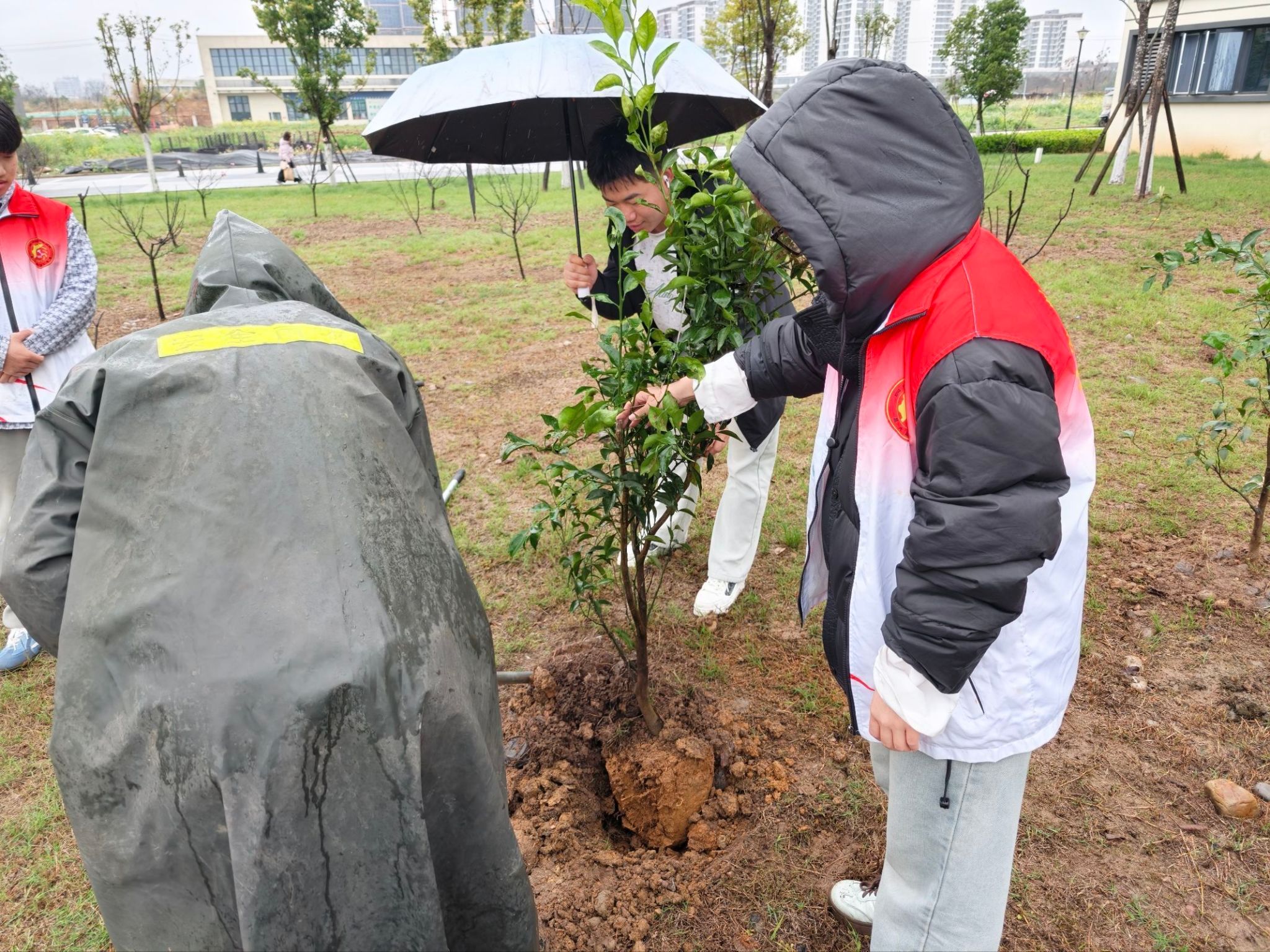 活动现场,志愿者们分工协作、干劲十足。大家手持铁锹、锄头,在专业人员的指导下,挖坑、扶苗、培土、压实,每一个步骤都有条不紊。有的同学细心扶稳树苗,确保其垂直端正;有的同学奋力挥动锄头,仔细回填土壤;还有同学主动撑伞,为同伴遮风挡雨。泥泞的草地没有成为阻碍,反而让大家的协作更加紧密,汗水与雨水交织,共同浇灌着新生的绿意。