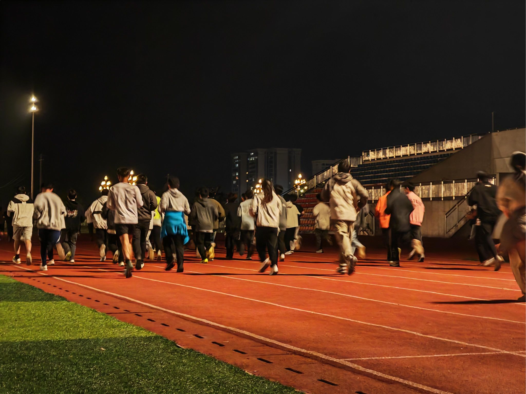 晚上20:10,随着晚自习下课铃声响起,同学们陆续来到邛崃产教园区操场集合。夜幕笼罩下的操场灯火通明,同学们精神饱满、热情高涨。在简短的动员热身之后,夜跑活动正式拉开帷幕。在曹书记和辅导员老师的带领下,师生们迈着矫健的步伐,沿着跑道有序前行。奔跑的队伍宛如一条流动的彩带,在夜色中格外醒目,青春的朝气与运动的激情在操场上空交织回荡。