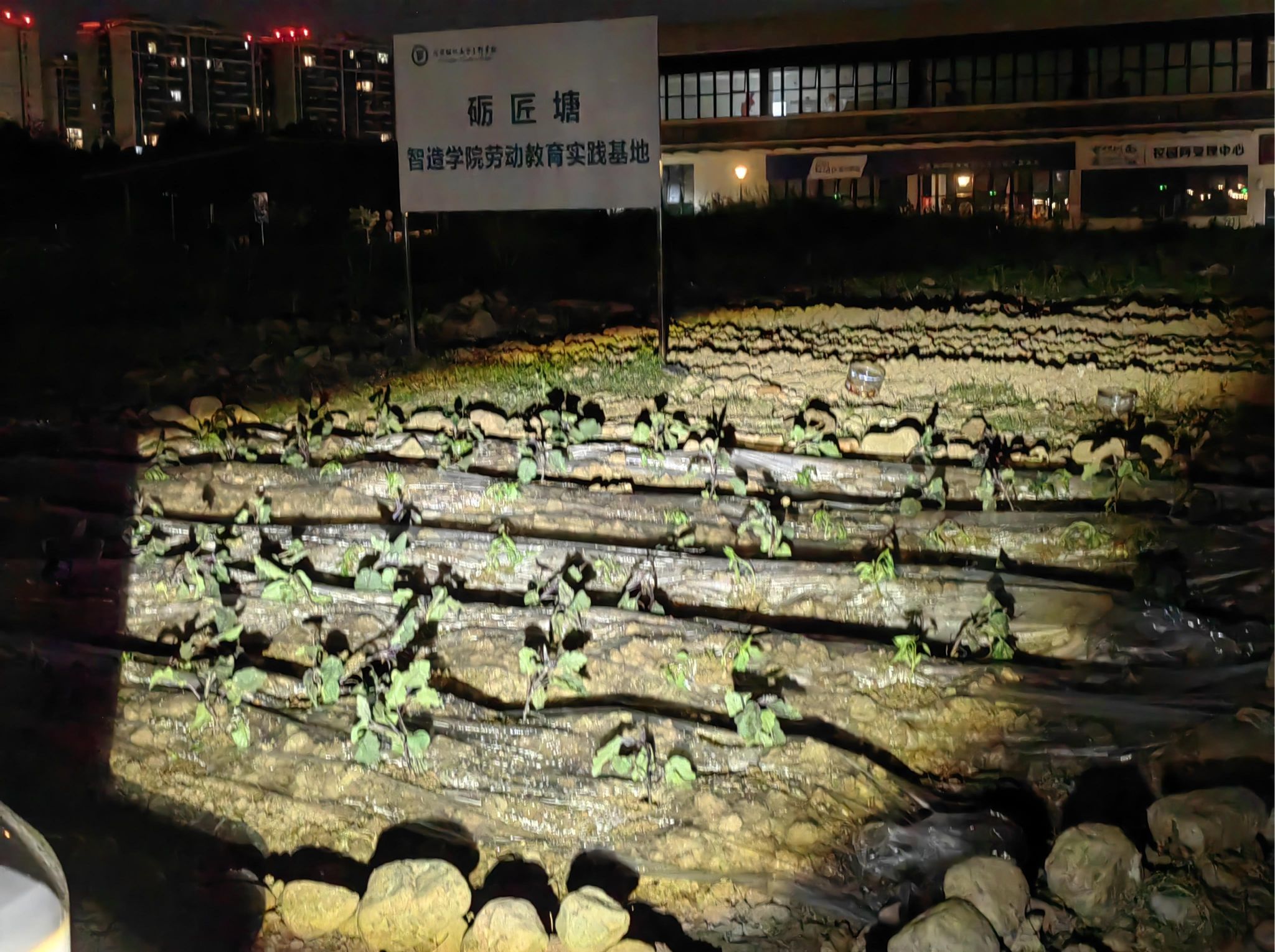 实践现场,在后勤专业老师的指导下,大学生们逐渐掌握翻土、播种、培土、浇水等农耕技巧,分组协作、分工明确,通过两个半小时的挥锹松土、平整地块,乱石混杂的土壤终于被整理成可耕种的地块。夜幕逐渐降临,同学们有条不紊地栽种幼苗,俯身培土压实,提桶浇灌幼苗,动作虽略显生疏却格外认真。大家挽起衣袖、脚踩泥土,不怕脏、不怕累,田间地头一派热火朝天的劳作景象。