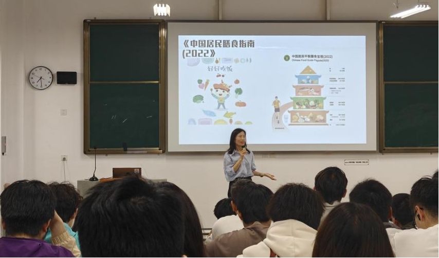 蒋佳芯以“大学生健康饮食课堂之我们该怎么吃”为主题,结合《中国居民膳食指南(2022)》核心内容,聚焦大学生日常饮食误区与健康需求,用朴实生动、通俗易懂的语言,系统讲解了健康饮食的核心概念、八条核心准则及“211饮食法”等实用知识。她重点提醒同学们注重食物多样化、坚持少盐少油、保持规律进餐,还特别结合大学生常吃零食的习惯,手把手教大家解读零食配料表,指导大家避开反式脂肪酸等不健康成分,帮助同学们树立科学的饮食观念。整场分享贴近大学生日常生活,内容实用、干货满满,现场互动氛围热烈,不少同学认真聆听、及时记录,切实收获了健康饮食的相关技巧。