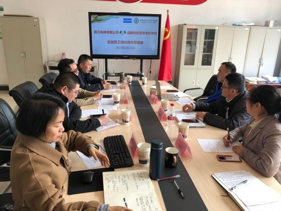 2023年3月21日,通力电梯有限公司维保能力发展经理王毅峻、技术培训经理谢胜宇和西部培训中心主管聂菊华一行3人专程来校,继续就建立通力电梯有限公司西部新入职员工岗前培训基地的相关事宜进行深层次的交流。学校继续教育中心主任隗送爽、智能制造与装备学院院长罗纲、副院长付学敏、电梯工程技术专业教研室主任朱霞在北苑会议室接待了来访客人。
